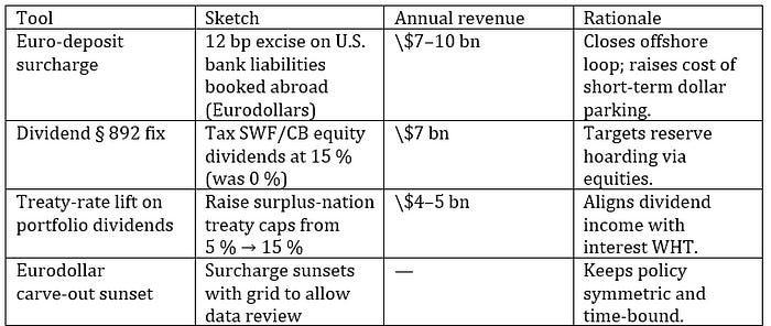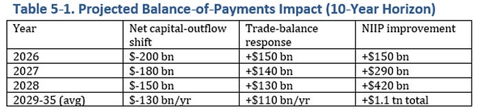 The schedule operates without Federal Reserve balance-sheet support and still raises roughly $1.2 trillion within the ten-year budget window, drawn entirely from foreign holders of U.S. securities rather than domestic taxpayers. It gives policymakers market stability, fiscal headroom, and a pathway to rebalance persistent external deficits.