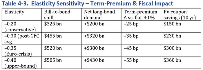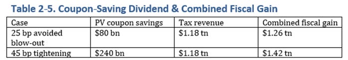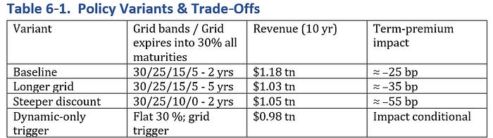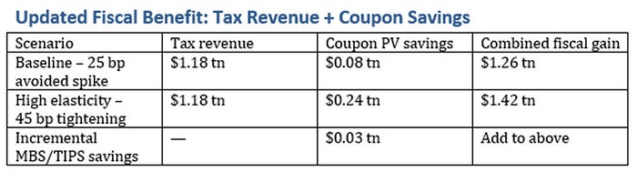 • Coupled with the dynamic trigger, the policy delivers $1.2 trillion in new revenue, $80–240 billion in coupon savings, and $35–40 billion per year in lower private‑sector borrowing costs, without any additional Federal Reserve asset purchases.