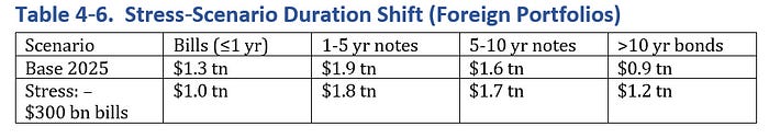 If every maturity were taxed at 30 percent, foreign reserve managers would lose roughly one‑third of the coupon on the $3 trillion of > 5‑year Treasuries they now hold. Historic flow elasticities imply they would either sell about $300 billion of long bonds outright or swap them to floating and re‑deposit proceeds in repo. Removing that duration from dealer balance‑sheets would widen the 10‑year term premium by roughly +25 basis points -comparable to the 2013 “Taper tantrum.”
