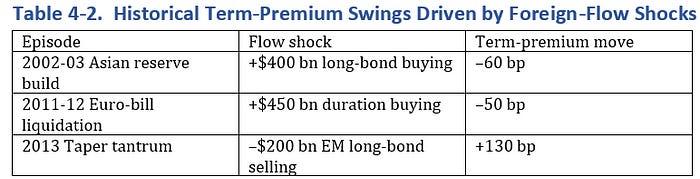 Past foreign‑flow shocks provide a yard‑stick for the term‑premium response we model.