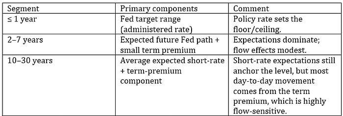 In other words, the long end is anchored by the anticipated path of policy, but the swings around that anchor — the part markets feel most acutely during a flow shock — are driven by changes in the term premium. Because front-end yields ride on administered rates, shifting foreign demand out of bills and into bonds dampens the long end without disturbing the Fed’s policy corridor. That is the core insight behind a maturity-linked WHT.