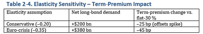 With ≤1‑year bills taxed at 30 percent but > 10‑year bonds at just 5 percent, reserve managers have a compelling reason to rotate out of bills and into duration. Using the Greenwood‑Vayanos demand framework we obtain the sensitivity shown in Table 4‑1.
