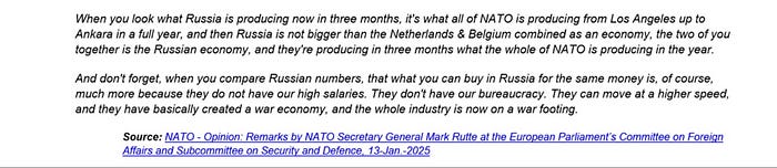 This military-style thinking makes perfect sense given the national security dimensions at stake. NATO Secretary General Mark Rutte recently warned that Russia is outproducing all NATO members 4-to-1 in military supplies, with its economy now on a war footing. Even more concerning, China possesses more manufacturing capacity than the United States, Europe, and Japan combined.